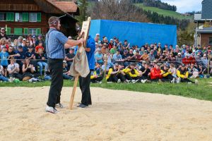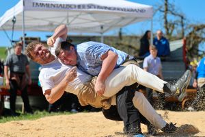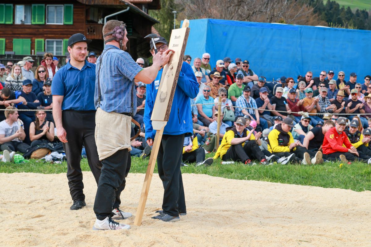 Sehr viele Zuschauer genossen das schöne und warme Frühlingswetter in Zäziwil mit spannenden Gängen und guter Festwirtschaft. Der Schlussgang gewinnt der Einheimische Michael Moser nach nur 59 Sekunden mit Innerem Hacken und Nachdrücken gegen den Truber Thomas Wüthrich.