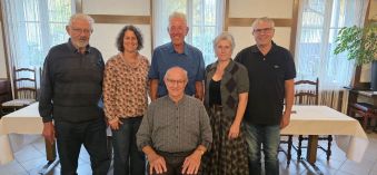 Der anwesende Jubilar zusammen mit der Obmannschaft. Hintere Reihe v.l.: Martin Neuenschwander, Tanja Grosjean-Fankhauser, Urs Stettler, Steffi Grimm Dick, Paul Affolter, vorne sitzend Ernst Allenbach